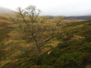 Elsewhere in Gleann Einich trees are establishing by their own accord. Pine and birch seed is small and light and can travel long distances on the wind. Rowan is dispersed by birds that head into the high cories looking for other berries. Growth rates are so slow at these altitudes that trees may only establish in locations least frequented by deer – rocky scree, steep slopes and windy hill-sides. Growth is also curtailed by winds that snap stems or drive sand and ice particles that strips bark off the stems, especially when there is little snow to cover the young trees.